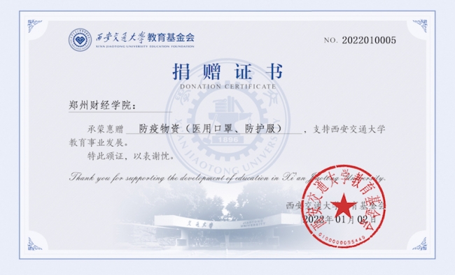 防疫物资送达后,西安交通大学教育基金会、西安交通大学管理学院分别向永利官网发来捐赠证书与感谢信,感谢永利官网秉持大义,无私援助,为学校进一步做好疫情防控和安全稳定工作提供保障。